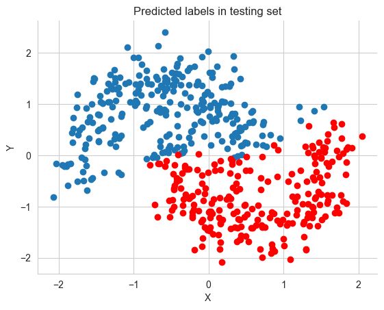 ax.set(title='Predicted labels in testing set', xlabel='X', ylabel='Y');
